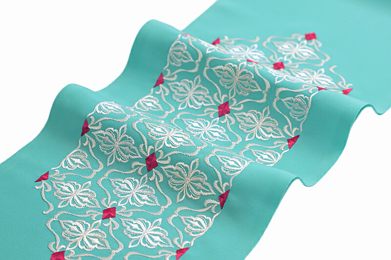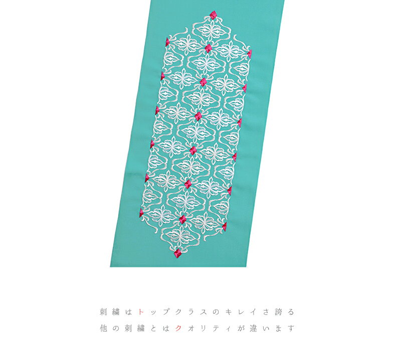 半衿 半襟 振袖 成人式 豪華刺繍 青緑 翡翠色 ターコイズブルー 水色地 ピンク糸 白糸 エメラルドグリーン エメラルドブルー ダマスク模様 ダマスク柄 シルエリー Silelly おしゃれ半衿 刺繍半衿 お洒落着用 レトロ アンティーク モダン 高級 成人式 結婚式 前撮り 卒業式 謝恩会 入学式 卒園式 入園式 七五三 お宮参り お茶会 パーティー 観劇 かわいい ポリエステル 日本製 No.10-0686 サイズ表 cm サイズ 長さ:約110cm 幅:約16.0cm 商品詳細 ■素材 ・生地 ポリエステル100% ・刺繍糸 レーヨン100%(金属糸使用の場合あり) ■詳細 ・新合繊 Silelly シルエリー ・豪華刺繍 ・日本製 ■カラー 水色地に ピンク糸 白糸の刺繍 ■合せる着物 振袖 二尺袖 中振袖 訪問着 色無地 付下げ 小紋 紬 ■着用シーン 成人式 結婚式 前撮り 卒業式 謝恩会 入学式 卒園式 入園式 七五三 お宮参り お茶会 パーティー 観劇 状態 ■新品・未使用品 コメント 豪華刺繍でコーディネートに差をつける! 何枚も欲しくなるような色柄が魅力的なシルエリーお洒落半衿のご紹介です。