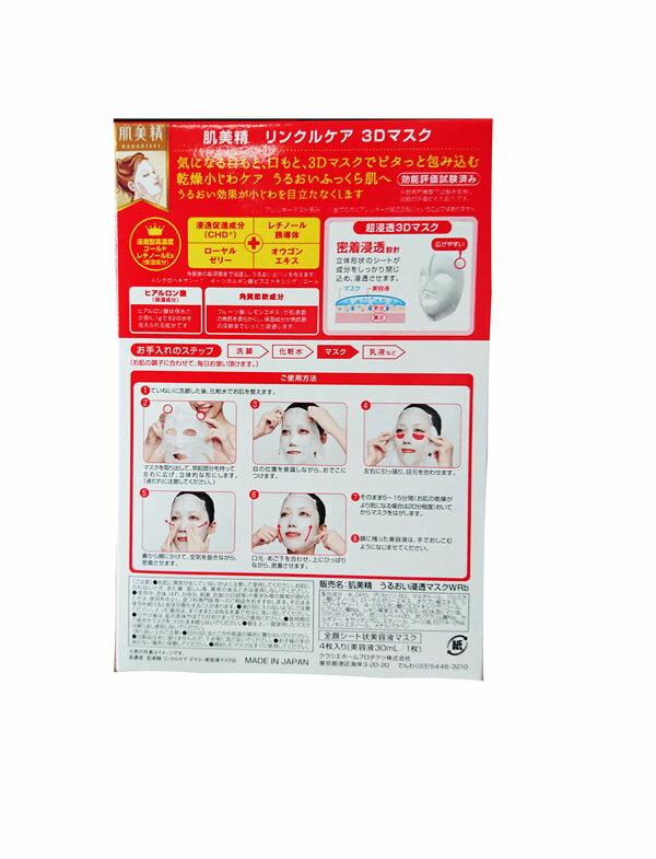 商 品 説 明 商品名 肌美精 超立体3Dマスク 乾燥小じわケア 4枚入 商品特徴 浸透型高濃度ゴールドレチノールEx + ヒアルロン酸 気になる目元、口元、3Dマスクでピタッと包み込む乾燥による小じわケア!うるおいふっくら肌へ。